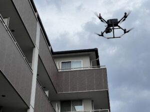 高層ビルやマンションの点検において、従来は作業員が高所でロープに吊られて作業する必要がありましたが、ドローン調査では作業者が地上からリモート操作で点検を完了できます。